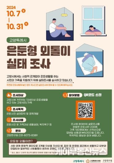 케이부동산뉴스 김교민 기자 | 고양특례시는 고양연구원과 함께 오는 31일까지 ‘은둔형 외톨이 실태조사’를 진행한다고 밝혔다.