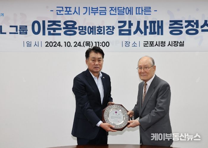 케이부동산뉴스 김교민 기자 | 하은호 군포시장은 25일 시장실에서 DL그룹 이준용 명예회장에게 감사패를 전달했다.