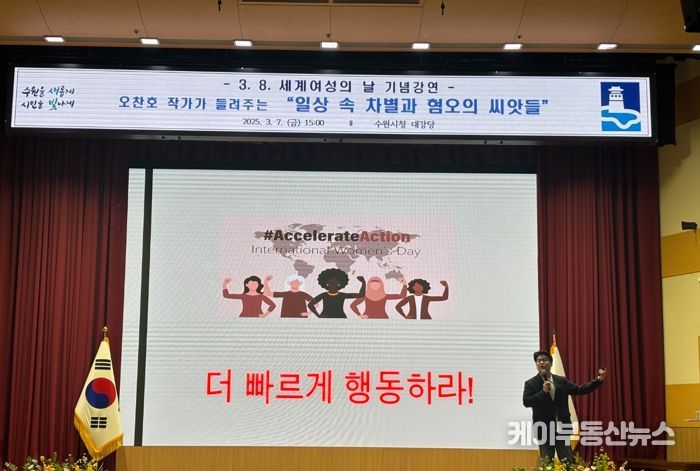 케이부동산뉴스 김교민 기자 | 수원시가 ‘세계여성의 날(3월 8일)’을 기념해 7일 수원시청 대강당에서 오찬호 작가의 특강을 열었다.