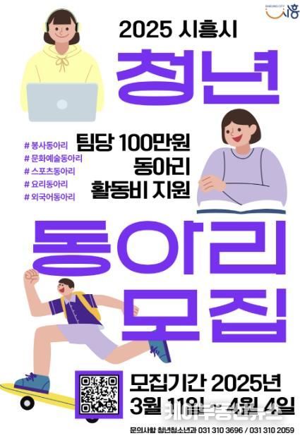 청년동아리 지원사업 신청은 모집 포스터의 큐아르 코드를 스캔하거나, 시흥시 청소년재단 동아리 지원사업 플랫폼 ‘흥모임’에 접속해서 할 수 있으며, 기타 문의 사항은 시흥시 청년청소년과로 하면 된다.