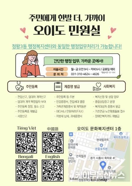 정왕3동 행정복지센터는 오이도 민원실 이용 활성화를 위해 홍보물을 제작해 옥터초등학교, 오이도 문화복지센터 등 관계기관을 통해 배포할 예정이다. 또한, 외국인 주민의 편의를 고려해 베트남어, 방글라데시어, 중국어, 영어로 제공되는 큐아르 코드를 별도로 제작해 안내할 계획이다.
