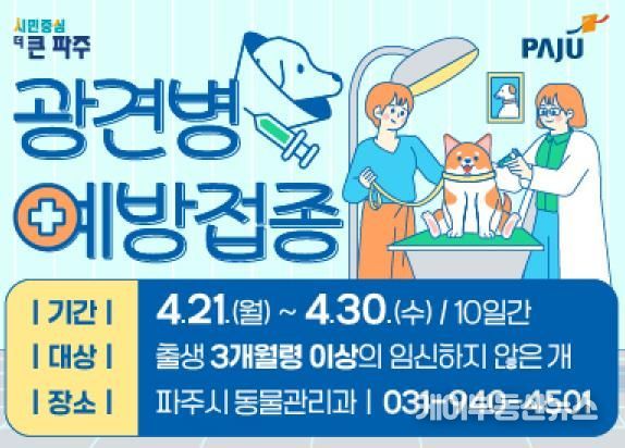 케이부동산뉴스 김교민 기자 | 파주시는 반려견을 동반한 야외 활동이 잦아지는 봄철을 맞아 오는 21일부터 30일까지 생후 3개월 이상의 임신하지 않은 개를 대상으로 광견병 예방접종을 실시한다고 밝혔다.