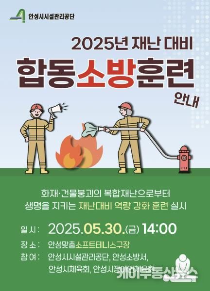 케이부동산뉴스 김교민 기자 | 안성시시설관리공단은 오는 30일 안성맞춤소프트테니스구장에서 ‘2025년 재난대비 합동 소방훈련’을 실시한다고 밝혔다.