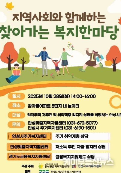 케이부동산뉴스 김교민 기자 | 안성시는 오는 10월 28일 오후 2시부터 4시까지 참아름아파트 5단지 내에서 ‘지역사회와 함께하는 찾아가는 복지 한마당’을 열고, 시민들을 대상으로 찾아가는 주거복지 이동상담소를 운영한다.