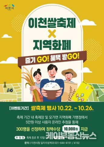 케이부동산뉴스 김교민 기자 | 이천시는 2025 이천쌀문화축제 기간에 지역화폐 이용을 촉진하고 지역경제를 활성화하기 위해 코나아이(주)의 경기지역화폐 사회공헌 재원을 활용하여 ‘이천쌀축제, 지역화폐로 즐기고(GO), 혜택받고(GO)’ 이벤트를 추진한다고 밝혔다.