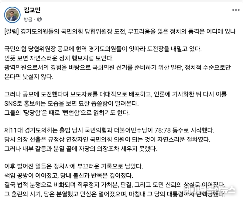 [칼럼] 경기도의원들의 국민의힘 당협위원장 도전, 부끄러움을 잃은 정치의 품격은 어디에 있나