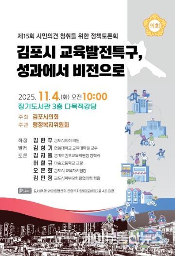 케이부동산뉴스 김교민 기자 | 김포시의회는 김포시 교육발전특구의 추진 성과를 점검하고 향후 비전과 정책 방향을 모색하기 위해 오는 11월 4일 장기도서관 3층 다목적강당에서 정책토론회를 개최한다.