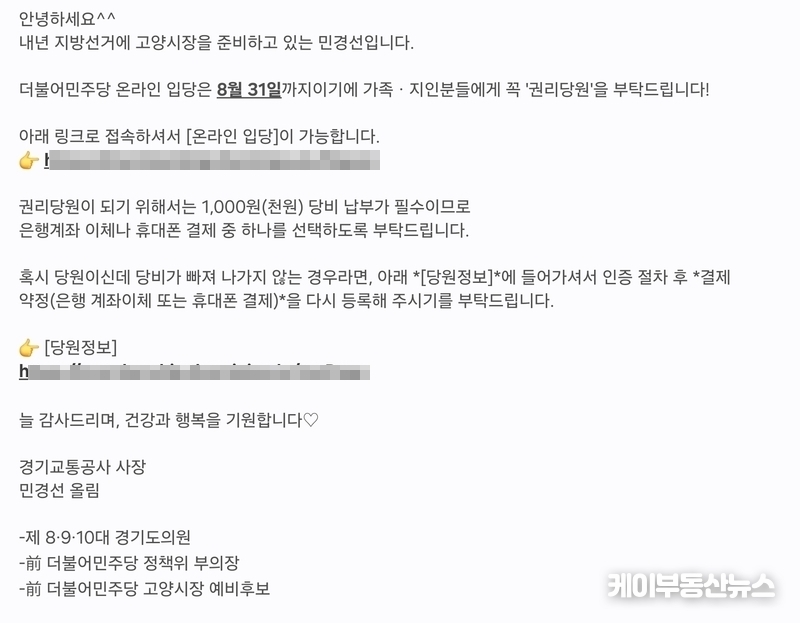 경기교통공사 민경선 사장은 내년 고양시장 출마를 준비하며 지난 8월 더불어민주당 권리당원 모집 문자를 발송했다.
