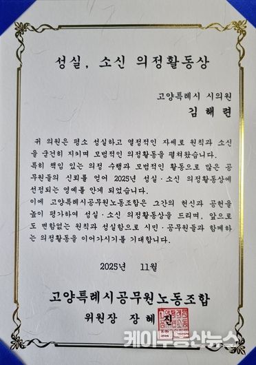 김해련 의원은 “3,500명이 넘는 고양시 공무원 여러분이 주신 상이라 더 무겁고 소중하다”며 “집행부를 감시·견제하는 역할은 냉정하게 하되, 시민을 위한 정책과 사업을 추진할 때는 공무원들과 한 팀이라는 마음으로 더 적극적으로 협력하겠다”고 답했다.
