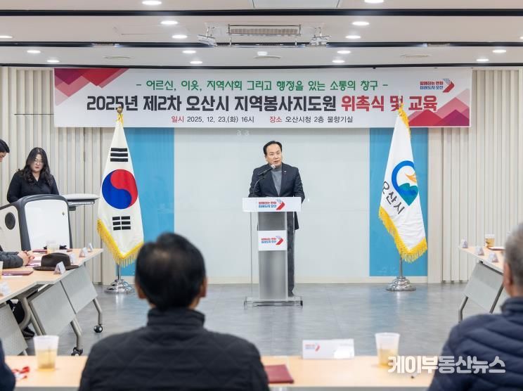 케이부동산뉴스 김교민 기자 | 오산시는 지난 23일 오산시청 물향기실에서 신규 경로당 회장을 대상으로 한 '2025년 지역봉사지도원 위촉식'을 개최했다고 밝혔다.