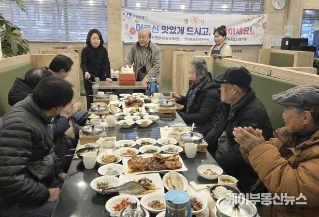 케이부동산뉴스 김교민 기자 | 수원시 장안구 연무동은 지난 15일 이교수한정식과 생신을 맞은 저소득 어르신들에게 따뜻한 한 끼를 대접하고 축하의 마음을 전하는 나눔 활동을 진행했다.