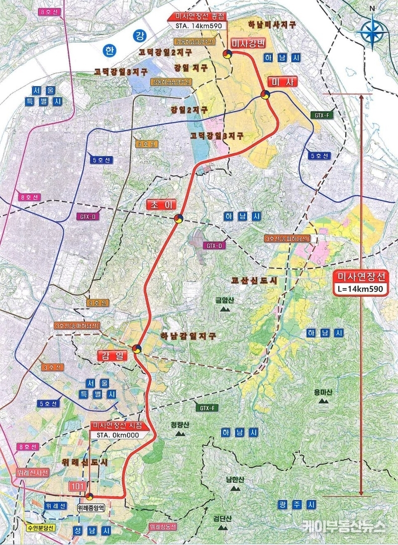 강 특보가 제시한 미사-위례선은 미사(9호선 계획 연계)에서 출발해 미사 5호선 환승, 황산·초이·감북을 거쳐 감일(3호선 계획 연계), 북위례·남위례 신규 역사 설치 후 위례신사선 위례중앙역과 연결되는 노선(안)이다.