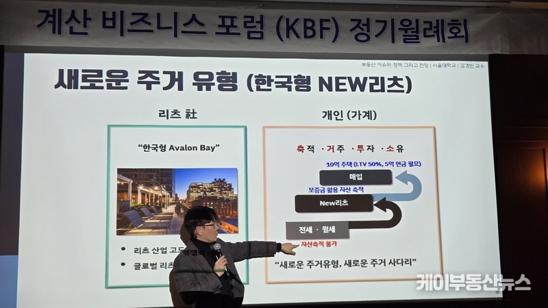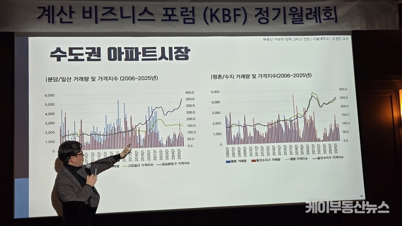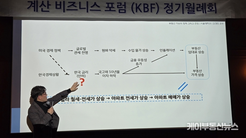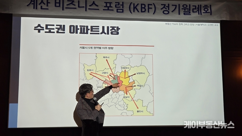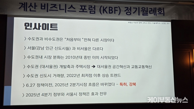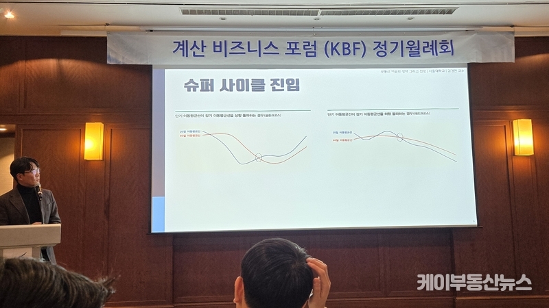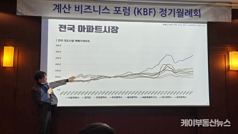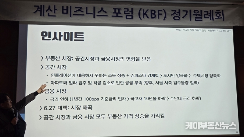 케이부동산뉴스 김교민 기자 | 김경민 서울대학교 환경대학원 교수는 27일 강남 노보텔 앰배서더 호텔 2층 프로방스룸에서 열린 KBF 계산비즈니스포럼 정기월례회 특강에서 현재 부동산 시장에 대해 “상승이냐 하락이냐로 단순하게 규정하기 어려운 국면”이라며, 시장 사이클과 이를 둘러싼 변수의 변화를 함께 살펴볼 필요가 있다고 진단했다.