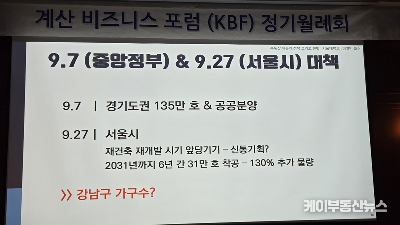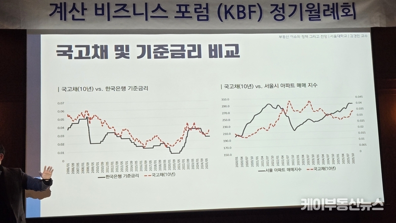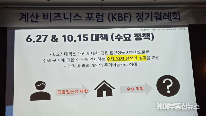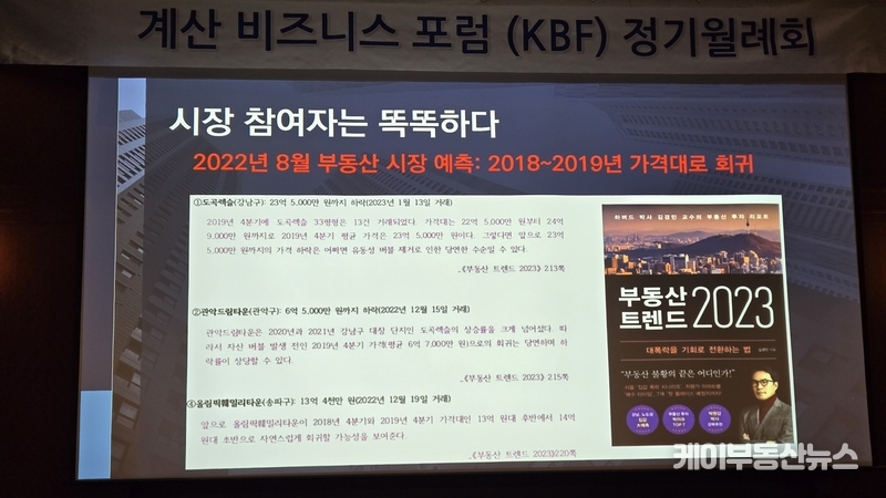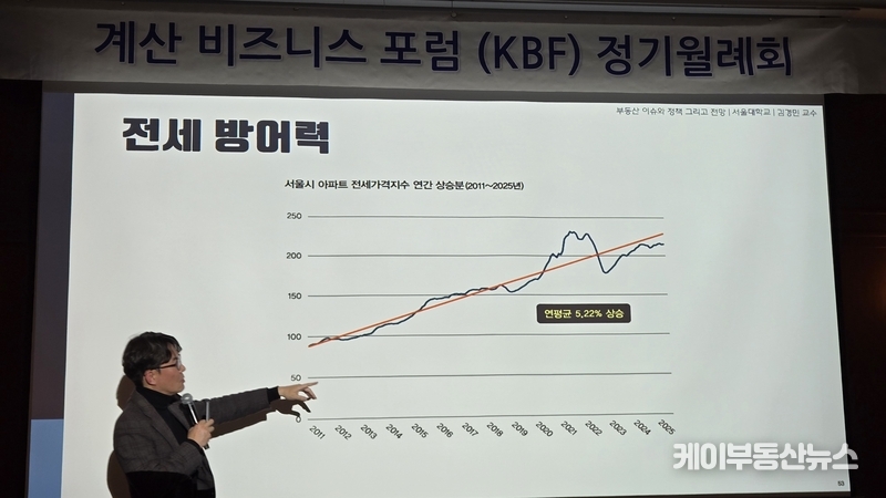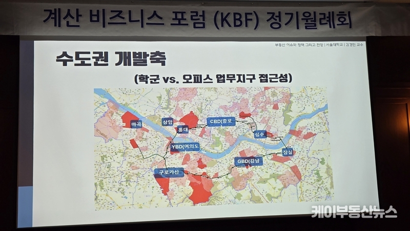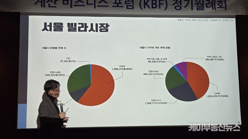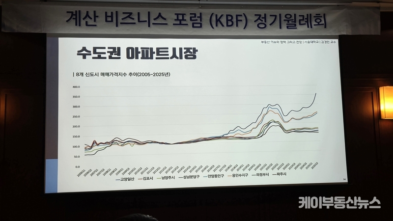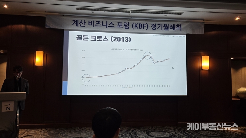 케이부동산뉴스 김교민 기자 | 김경민 서울대학교 환경대학원 교수는 27일 강남 노보텔 앰배서더 호텔 2층 프로방스룸에서 열린 KBF 계산비즈니스포럼 정기월례회 특강에서 현재 부동산 시장에 대해 “상승이냐 하락이냐로 단순하게 규정하기 어려운 국면”이라며, 시장 사이클과 이를 둘러싼 변수의 변화를 함께 살펴볼 필요가 있다고 진단했다.