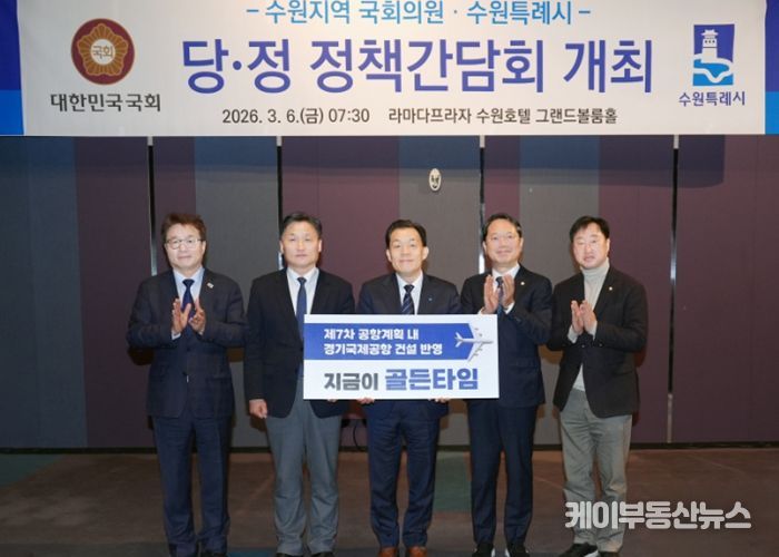케이부동산뉴스 김교민 기자 | 이재준 수원특례시장은 6일 라마다프라자 수원호텔에서 열린 지역 국회의원들과 당·정 정책간담회에서 “제7차 공항개발 종합계획에 ‘경기국제공항’ 건설 내용이 반영될 수 있도록, 경기도와 협의해 달라”고 요청했다.