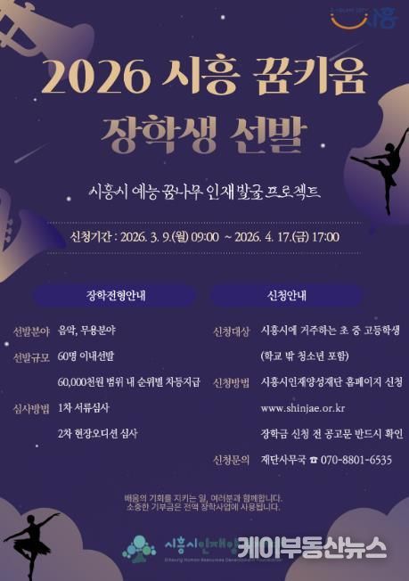 케이부동산뉴스 김교민 기자 | 시흥시인재양성재단은 지역 내 예능 분야 인재를 발굴ㆍ육성하기 위해 ‘2026년 시흥 꿈키움 장학생’을 60명 이내로 선발한다.