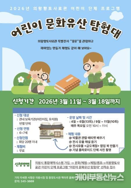 케이부동산뉴스 김교민 기자 | 의왕시 향토사료관이 오는 4월부터 6월, 9월부터 10월 매주 목요일에 어린이 단체 체험프로그램 ‘어린이 문화유산 탐험대’를 운영한다.