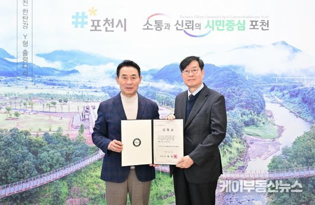 케이부동산뉴스 김교민 기자 | 포천시는 지난 10일 포천시장 집무실에서 ‘윤세징 일가 묘역 및 석물’ 향토유산 지정서 수여식을 개최하고 파평윤씨 종중 윤경환 회장에게 지정서를 전달했다.