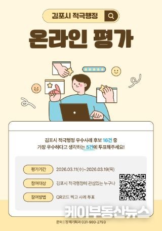 케이부동산뉴스 김교민 기자 | 김포시는 3월 11일부터 3월 19일까지 ‘2026년 제1차 적극행정 우수공무원 선발’을 위한 온라인 평가를 진행한다.