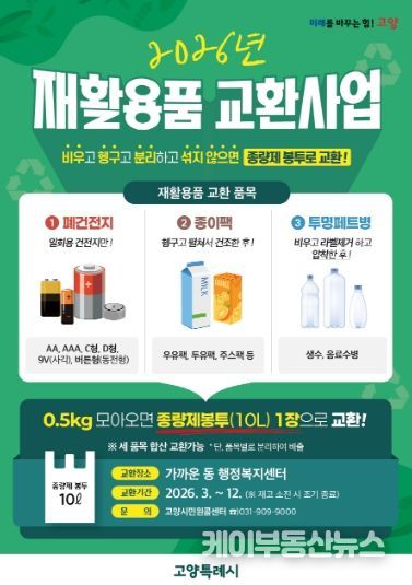 케이부동산뉴스 김교민 기자 | 고양특례시 덕양구 창릉동은 주민들의 자원 재활용 참여를 확대하고 올바른 분리배출 문화를 정착시키기 위해 ‘2026년 재활용품 교환사업’을 운영한다고 밝혔다.