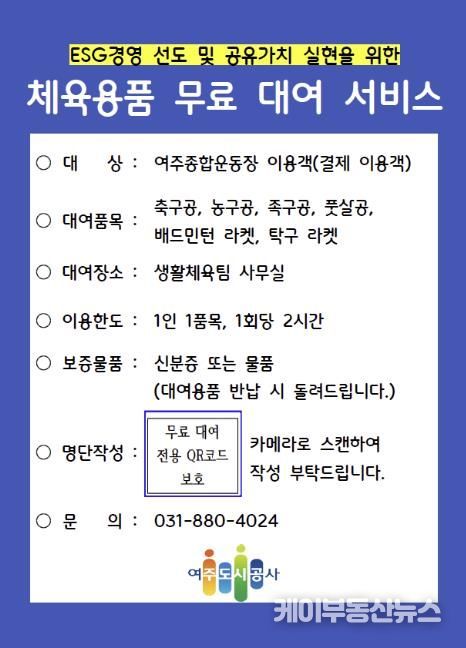 케이부동산뉴스 김교민 기자 | 여주도시공사는 여주종합운동장 이용 시민들의 편의를 높이기 위해, 2023년부터 시행해 온 ‘체육용품 무료대여 서비스’를 오는 2026년 4월 1일부터 대폭 확대 운영한다.
