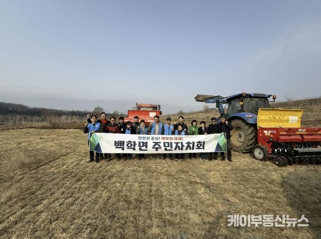 케이부동산뉴스 김교민 기자 | 연천군 백학면 주민자치회는 지난 9일~11일 3일간 자치회 위원 30여 명이 참여한 가운데 임진강변 비룡대교 일원에 청보리를 파종했다.