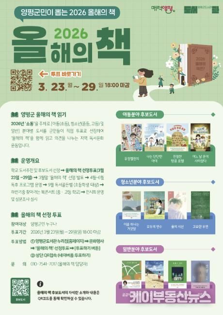케이부동산뉴스 김교민 기자 | 양평군은 지역 주민과 함께 한 권의 책을 읽고 공감하는 독서문화 확산을 위해 2026년 ‘올해의 책’ 후보 도서를 선정하고 군민 투표를 실시한다고 밝혔다.