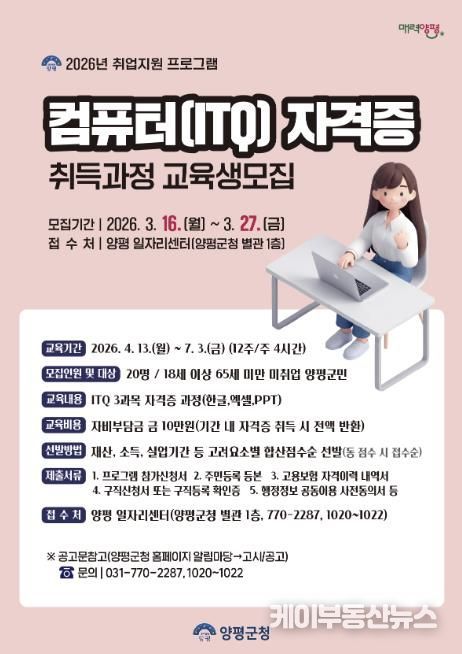 케이부동산뉴스 김교민 기자 | 양평군은 오는 16일부터 디지털 기반 업무 환경에 대응할 수 있는 실무형 인재 양성과 지역 일자리 창출을 위해 2026년 취업지원 프로그램 ‘컴퓨터(ITQ) 자격증 취득과정’ 교육생을 모집한다.