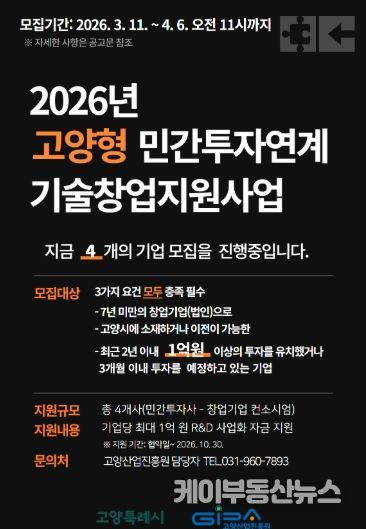 케이부동산뉴스 김교민 기자 | 고양산업진흥원이 유망 기술창업기업의 투자 유치와 기술 고도화를 지원하기 위한 ‘2026년 고양형 민간투자연계 기술창업지원사업’에 참여할 창업기업을 모집한다.