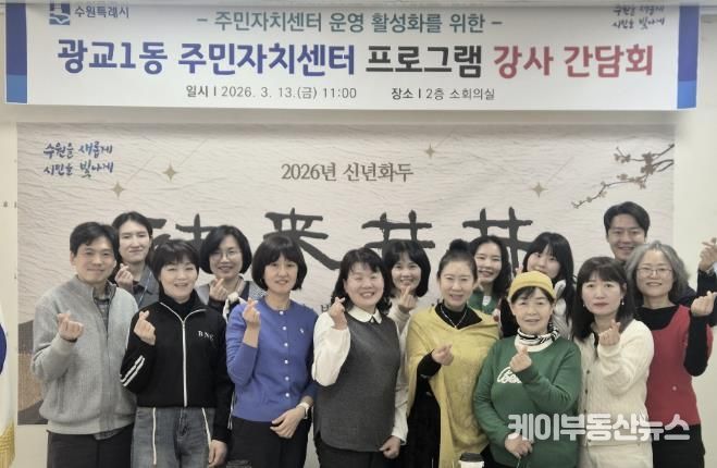 케이부동산뉴스 김교민 기자 | 수원특례시 영통구 광교1동은 지난 13일 광교1동 주민자치센터 활성화와 운영 개선 방안을 모색하기 위해 주민자치센터 프로그램 강사 간담회를 개최했다.