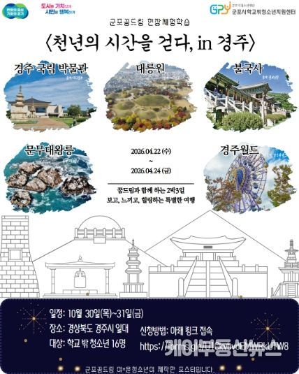 케이부동산뉴스 김교민 기자 | (재)군포시청소년재단(대표이사 김덕희) 군포시학교밖청소년지원센터(센터장 강연미)는 학교 밖 청소년 16명을 대상으로 오는 4월 22일부터 24일까지 2박 3일간 경상북도 경주시 일대에서 ‘역사캠프 현장체험학습 프로그램’을 운영한다고 밝혔다. 참가신청은 구글폼 등을 통해 접수 받은 뒤 신청 내용을 바탕으로 참여 대상자를 선정할 예정이다.