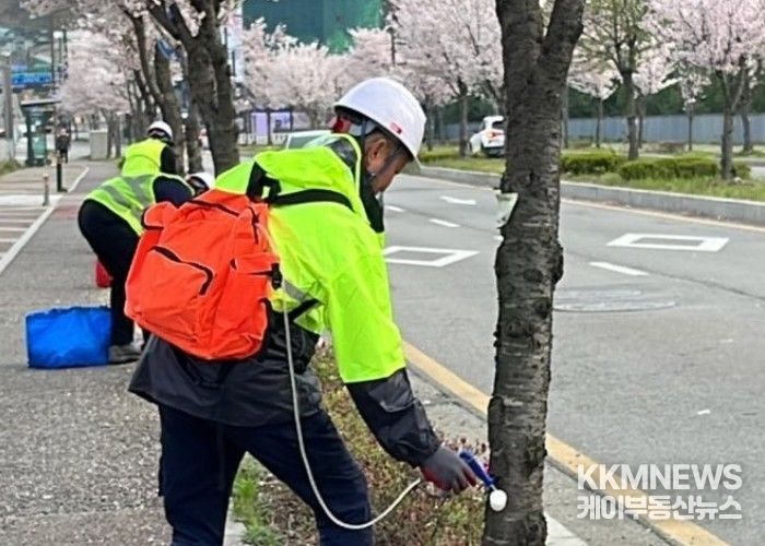 KKMNEWS 김교민 기자 | 화성특례시 만세구는 최근 증가하는 식엽성 해충 피해에 대응하기 위해 주요 벚나무길을 중심으로 수간주사 방제를 실시했다고 27일 밝혔다.