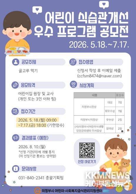 KKMNEWS 김교민 기자 | 의정부시가 운영하는 의정부시 어린이‧사회복지급식관리지원센터는 어린이 보육시설을 대상으로 5월 18일부터 7월 17일까지 ‘어린이 식습관 개선 우수 프로그램 공모전’을 개최한다.