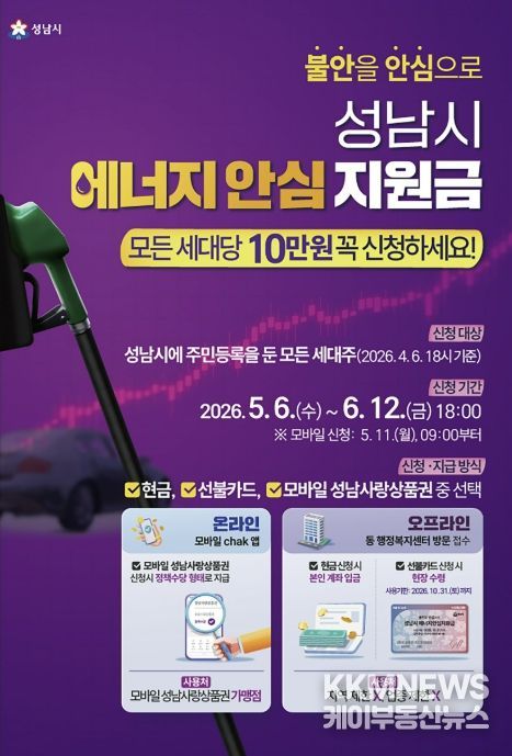 KKMNEWS 김교민 기자 | 성남시는 중동 사태에 따른 국가 자원안보 위기 경보 발령으로 경제적 부담이 커진 시민들을 지원하기 위해 전국 최초로 ‘성남시 에너지 안심지원금’을 오는 5월 6일부터 신청을 받는다고 밝혔다.