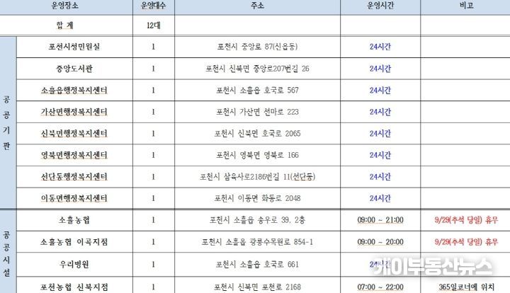케이부동산뉴스 김교민 기자 | 포천시는 추석 연휴기간인 오는 28일부터 10월 3일까지 무인민원발급창구를 정상적으로 운영해 민원인의 불편을 최소화할 예정이라고 밝혔다.