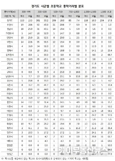 우선 연구원은 초등학교별 학구도(통학구역) 면적을 원으로 가정해 그 반경을 통학거리로 산출했다. 학구도 정보가 있는 도내 초등학교 1천147개교의 평균 통학거리는 860m, 중앙값은 530m로 분석됐다. 평균 통학거리가 1.5km를 초과하는 학교는 204개교(17.8%)나 됐다. 시군별로는 가평군이 3km로 가장 멀었는데, 이는 지도상 직선거리로 실제 교량 등을 지나는 통학거리는 더 늘어날 수 있다. 통학거리가 가장 짧은 곳은 안양시로 400m였다.