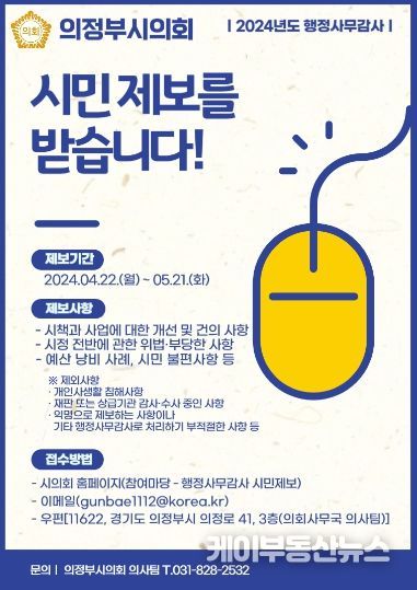 케이부동산뉴스 김교민 기자 | 의정부시의회는 2024년도 행정사무감사(6.11.~6.19.)를 앞두고 보다 내실있는 행정사무감사를 추진하기 위해 4월 22일부터 5월 21일까지 시민 제보 접수를 받는다고 22일 밝혔다.