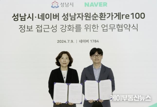 이를 위해 시는 전날 분당구 정자동 네이버 본사 27층에서 허은 환경보건국장과 임동아 네이버 대외/ESG정책 리더 등이 참석한 가운데 ‘성남자원순환가게re100 정보 접근성 강화를 위한 업무 협약’을 체결했다.
