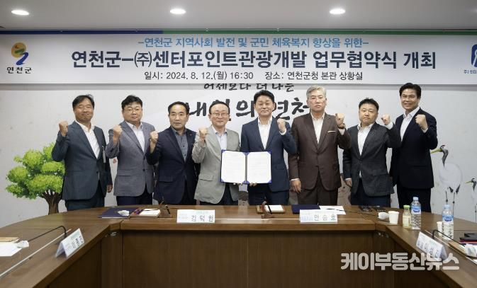 케이부동산뉴스 김교민 기자 | 연천군과 ㈜센터포인트관광개발은 지난 12일 연천군청 본관 2층 상황실에서 지역사회 발전 및 군민 체육 복지 향상을 위한 업무협약을 체결했다고 밝혔다.