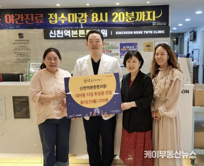 케이부동산뉴스 김교민 기자 | 신천역본튼튼의원이 지난 24일 휴지 30개들이 200세트를 대야동 마을자치과에 전달했다.