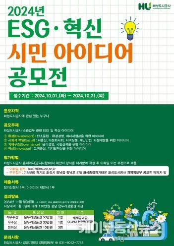 케이부동산뉴스 김교민 기자 | 화성도시공사는 10월 1일부터 31일까지 한 달간 ‘ESG 혁신 아이디어 공모전’을 개최한다고 밝혔다. 이번 공모전은 ESG 경영을 지역사회에 확산시키고, 시민의 창의적인 아이디어를 공사의 경영에 반영해 시민의 경영 참여를 활성화하기 위해 마련됐다.