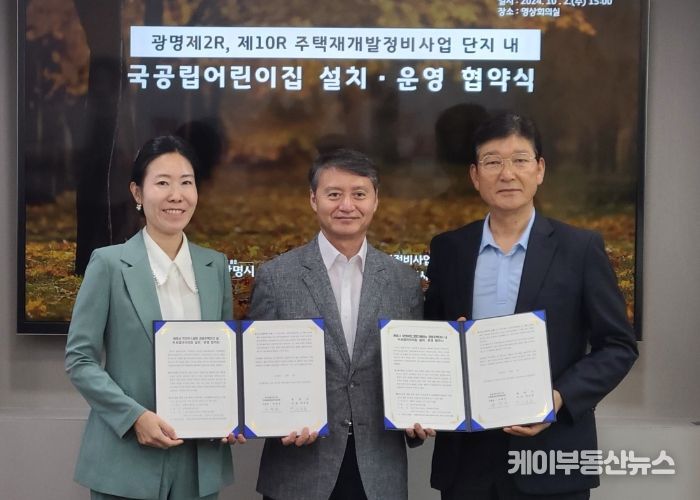 시는 2일 오후 시청 영상회의실에서 광명제2R구역주택재개발정비사업조합, 광명제10R구역주택재개발정비사업조합과 트리우스광명, 호반써밋그랜드에비뉴 단지 내 국공립어린이집 설치․운영 협약을 체결했다.