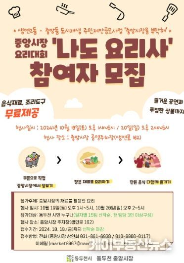 케이부동산뉴스 김교민 기자 | 동두천 중앙시장 상인회는 전통시장 홍보와 상권 활성화를 위해 10월 19일, 20일 이틀에 걸쳐 중앙시장 공영주차장에서 요리대회 '나도 요리사' 행사를 개최한다.