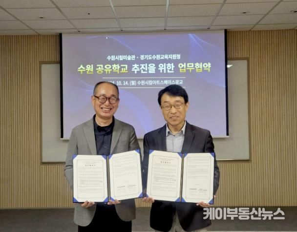 케이부동산뉴스 김교민 기자 | 경기도 수원시립미술관은 경기도수원교육지원청과 수원 공유학교 추진을 위한 업무협약을 수원시립아트스페이스광교에서 10월 14일 체결했다.