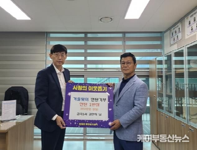 케이부동산뉴스 김교민 기자 | 파주시 법원읍은 지난 15일, 금곡1리에 거주하는 김만식 하우룩 대표로부터 연탄 1만 장 상당의 지원금 850만 원을 기부받았다고 밝혔다.