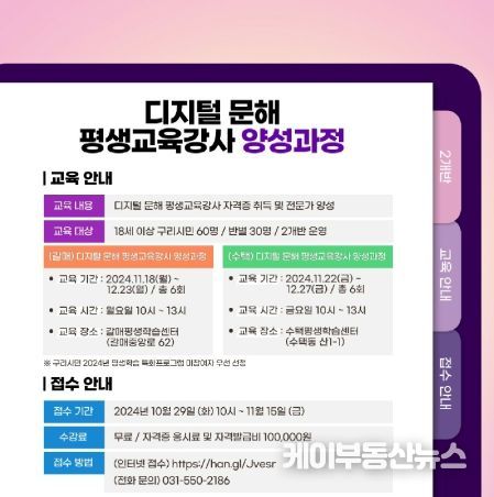 케이부동산뉴스 김교민 기자 | 구리시는 시민 역량을 한층 강화하기 위한 사업의 하나로 『디지털 문해 평생교육 강사 양성 과정』을 운영한다고 밝혔다.