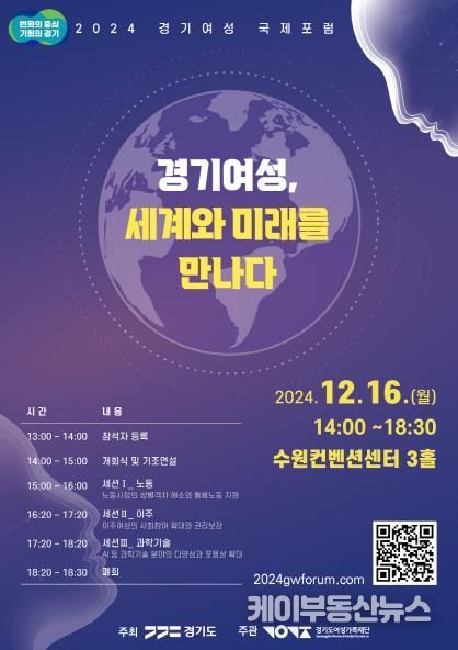 케이부동산뉴스 김교민 기자 | 광역지자체 최초 국제 여성정책 포럼인 ‘2024 경기여성 국제포럼’이 오는 16일 수원컨벤션센터에서 열린다.