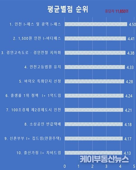 이어 인천 모든 섬을 방문할 수 있는 ‘인천 아이() 바다패스’가 4.41점, 경인고속도로·경인전철 지하화 본격 추진사업이 4.38점으로 높은 평가를 받았다.