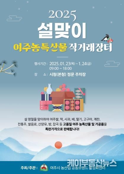케이부동산뉴스 김교민 기자 | 여주시가 오는 1월 23일부터 24일까지 오전9시부터 오후6시까지 이틀간 여주시청 광장에서 "2025 설맞이 여주농특산물 직거래장터"를 개최한다. 이번 행사에서는 여주 지역의 고품질 농특산물을 특판 가격에 만나볼 수 있다.