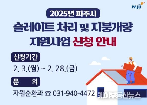 케이부동산뉴스 김교민 기자 | 파주시는 노후 슬레이트 주택에 대한 시민건강 피해를 예방하고 쾌적한 생활환경을 조성하고자 2025년 슬레이트 철거 및 지붕개량 사업을 실시한다.